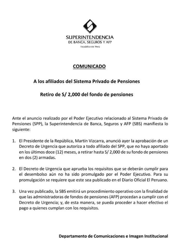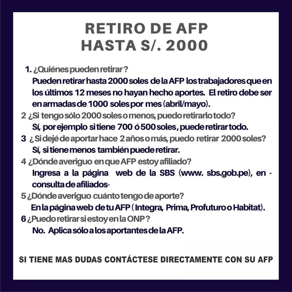 Trabajadores que no están en planilla podrán retirar hasta S/ 2,000 ( 2 partes ) de sus AFP.
