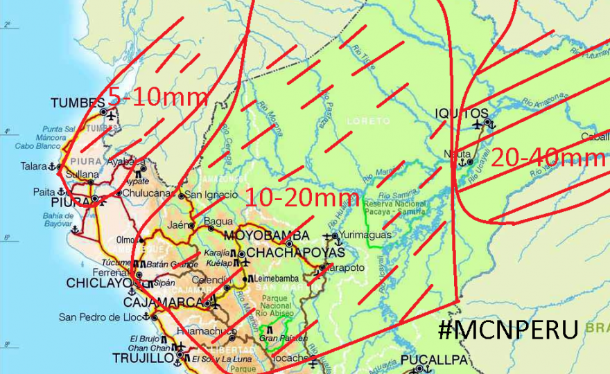 Probabilidad de lluvias ligeras a mediana intensidad para esta fecha en la zona del Dpto Tumbes entre 5 y 10mm total acumulado en el día , La Libertad, Lambayeque, Amazonas, Cajamarca, San Martin con entre 10 a 20mm y en Loreto entre 10 a 20mm tambien con actividad electrica y para el lado este con 20 a 40mm
