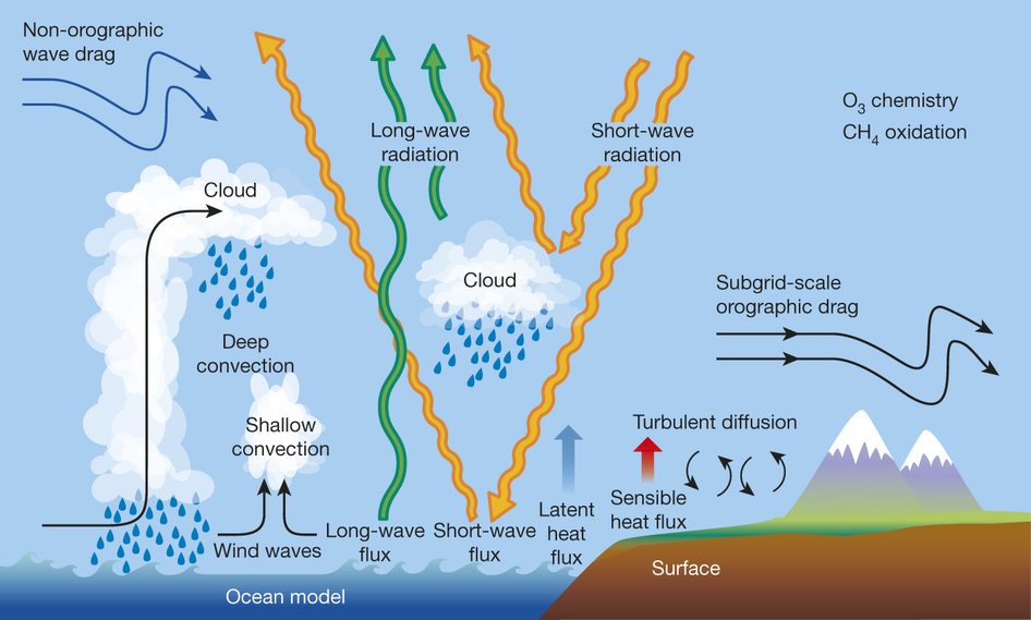 La figura que abre esta entrada resume los procesos físicos más importantes que hoy en día se incorporan en los modelos de predicción numérica. Muchos de estos procesos no se pueden resolver en detalle (pues se requiere llegar a escalas moleculares), pero se incorporan de forma aproximada mediante correlaciones. Estas mejoran conforme lo hace nuestra comprensión en detalle de los procesos físicos.